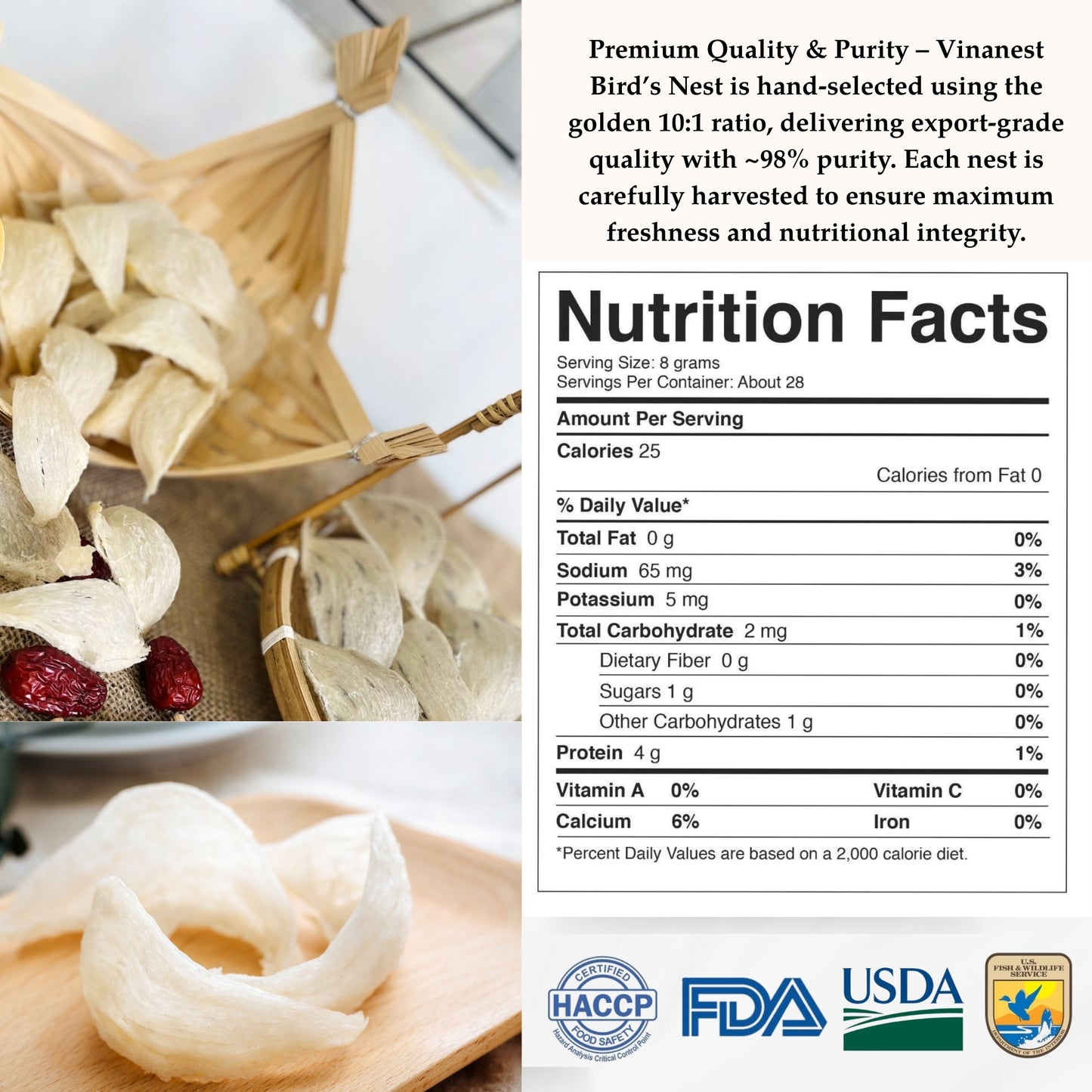 Premium Quality & Purity – Vinanest Bird’s Nest is hand-selected using the golden 10:1 ratio, delivering export-grade quality with ~98% purity. Each nest is carefully harvested to ensure maximum freshness and nutritional integrity.